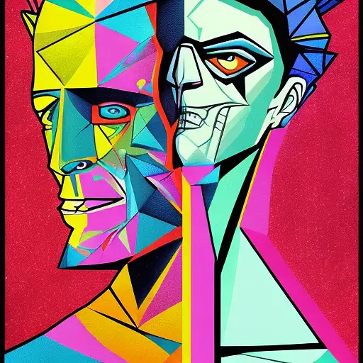 almost 3 years ago geometric abstract portrait of Frankenstein kissing the bride of Frankenstein , bright vibrant colorful, poster art --aspect 3:4 Pixometry 1 150