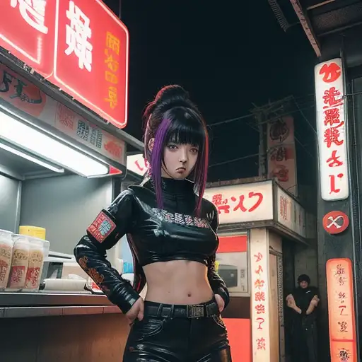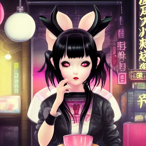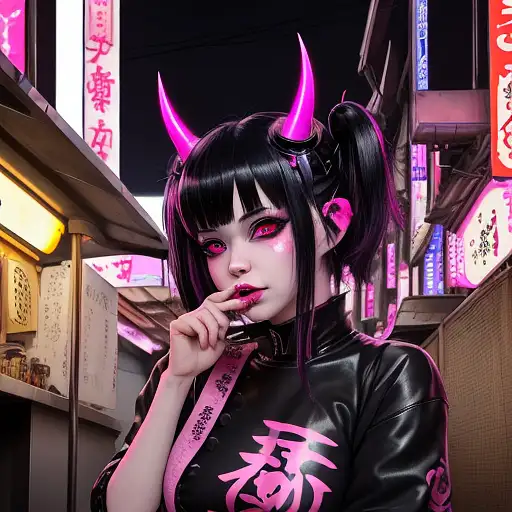 almost 2 years ago a kawaii techno demoness sits at a ramen stall in Neo-Tokyo. She has messy black hair, pink pupils, pink lips, and wears cyberpunk clothing. She has small black demon horns. anime style Prender 1 90