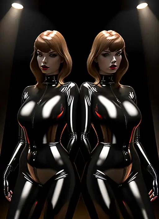 almost 2 years ago Two women in latex gear in a dimly lit room, with a spotlight from the left. Prender 0 70