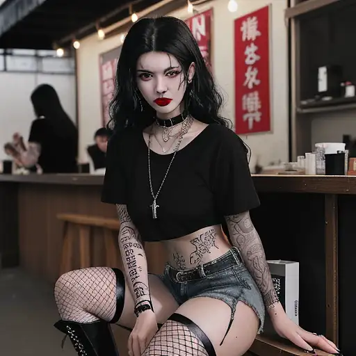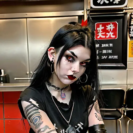 almost 2 years ago A goth girl, about 18 years old, messy black hair in an asymmetrical cut, brown eyes, thick eye makeup, red lips, heavily pierced ears, tattoo on her left arm, wearing a black T-shirt, necklaces, collar, black shorts with ripped fishnet stockings, heavy boots, looking at the camera, sitting at a ramen stand, smirking. , outline, white outline, purple haze, tilt-shift effect, shallow depth of field, neon color grading, low-angle shot Prender 0 160