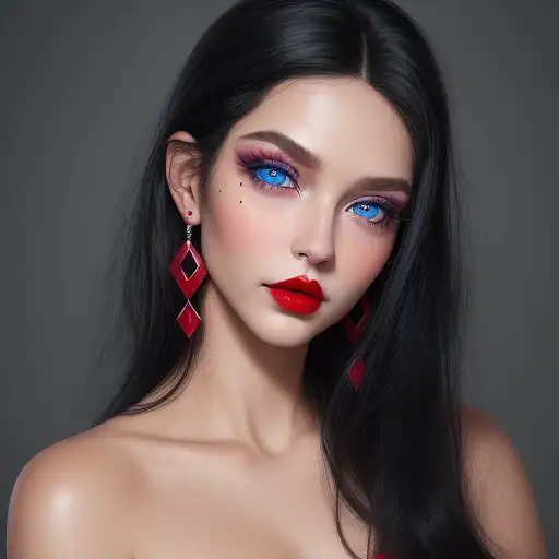 almost 2 years ago 8k,solo,1girl,solo,black hair,makeup,earrings,mole under eye,blush,jewelry,long hair,lipstick,red lips,eyeshadow,looking at viewer,colored skin,portrait,realistic,blue eyes, Prender 0 72