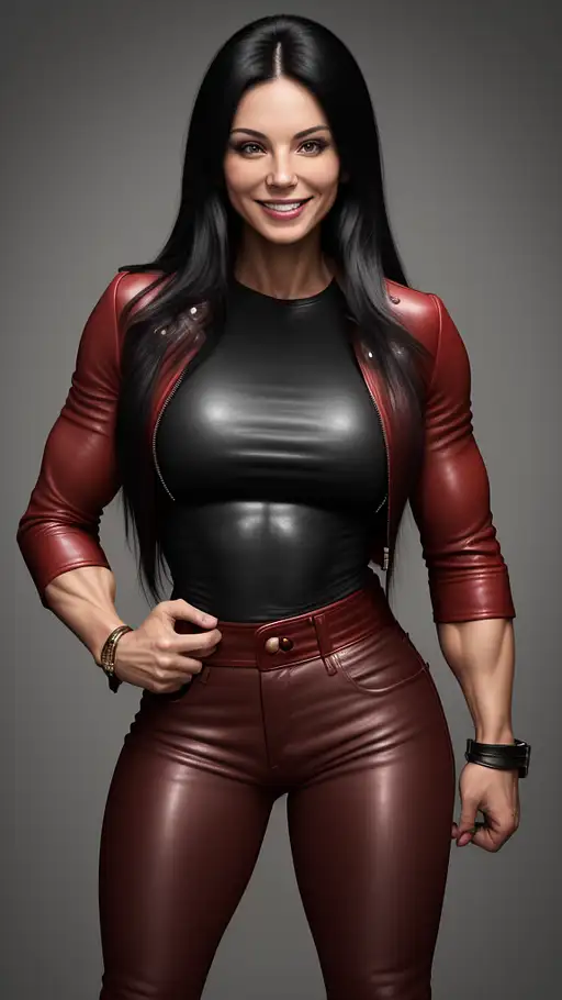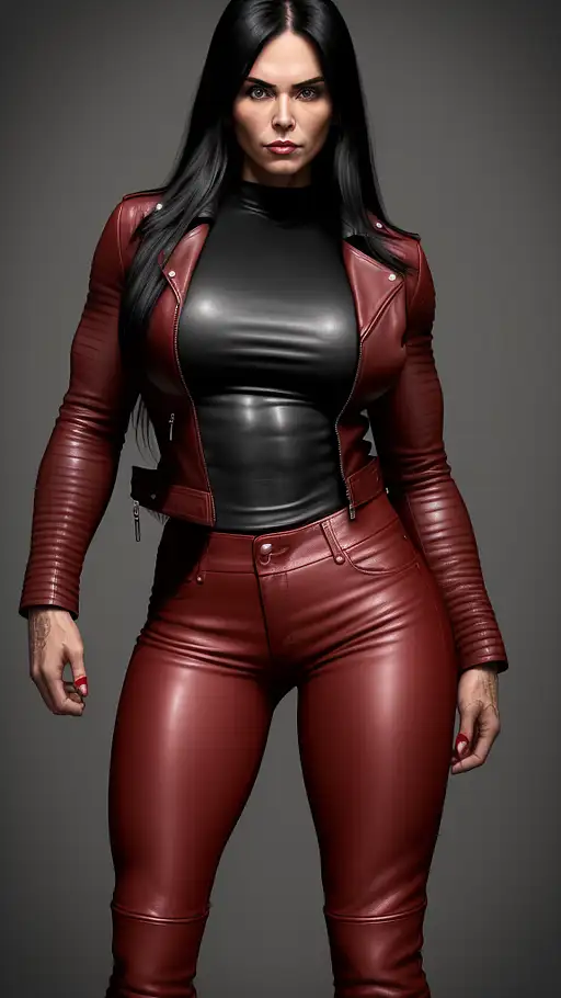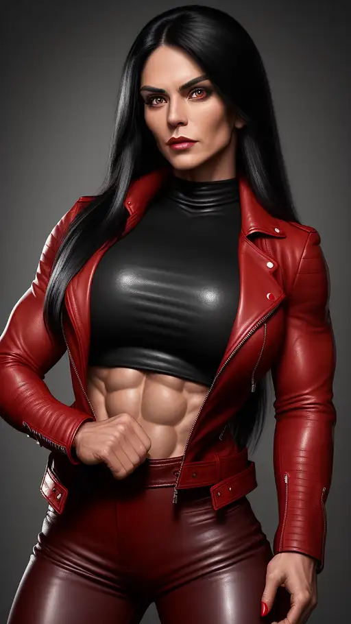 2 years ago 30 year old strong muscular woman, toned biceps, long black hair, wears red leather pants, wears red leather jacket Pressy 2 290