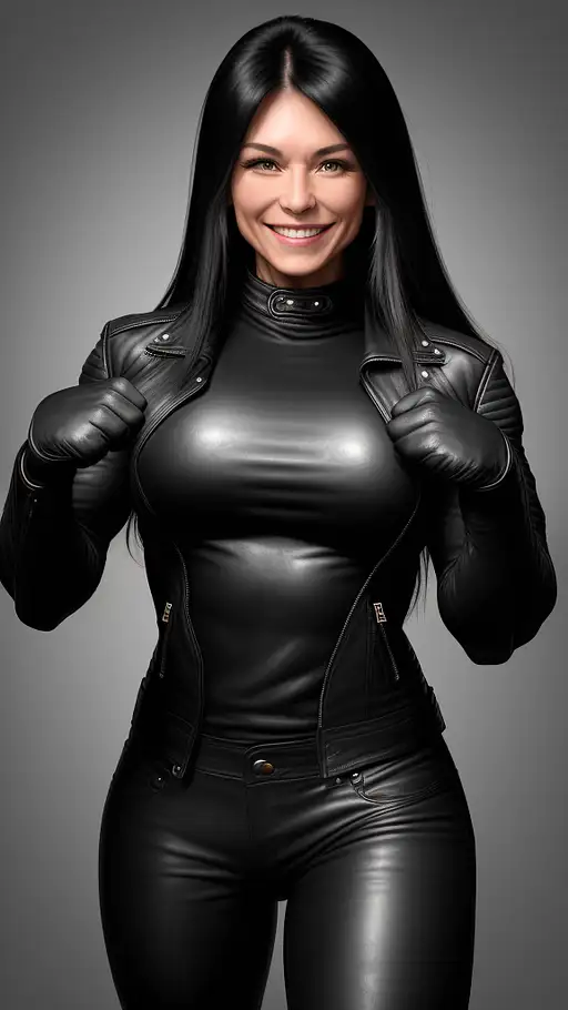 2 years ago 30 year old strong muscular woman, biceps, long black hair, wears leather jacket, wears leather jeans, smiling, black belt with buckle Pressy 0 130