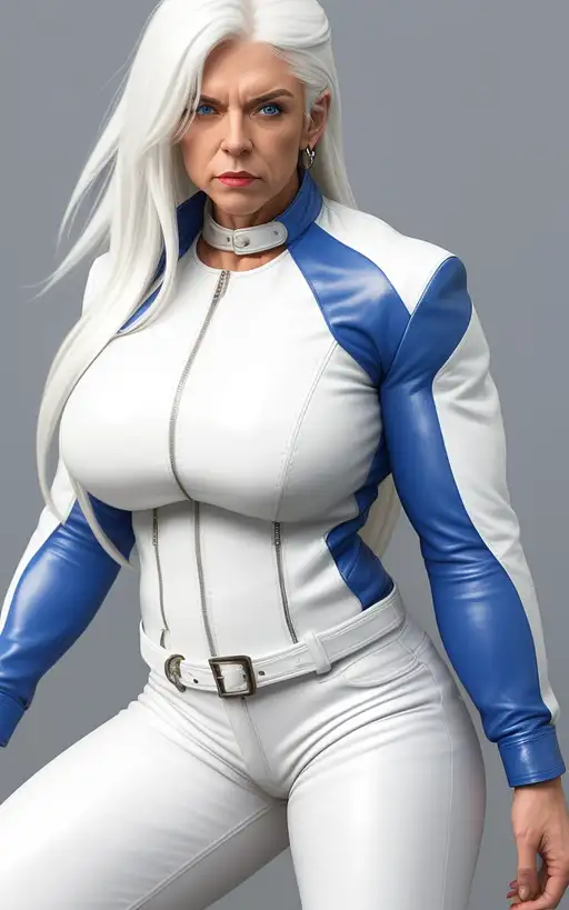2 years ago mid-age woman with muscles, biceps, long white hair, wears white leather pants, blue leather jacket, red shirt Pressy 0 100