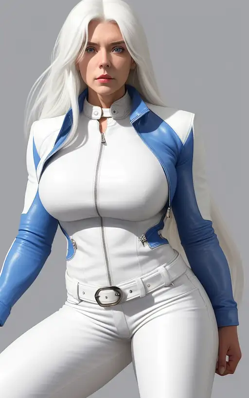 2 years ago 25 year old woman with muscles, biceps, long white hair, wears white leather pants, blue leather jacket, red shirt Pressy 0 41