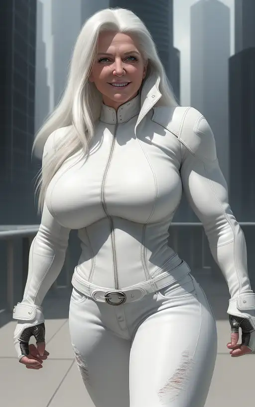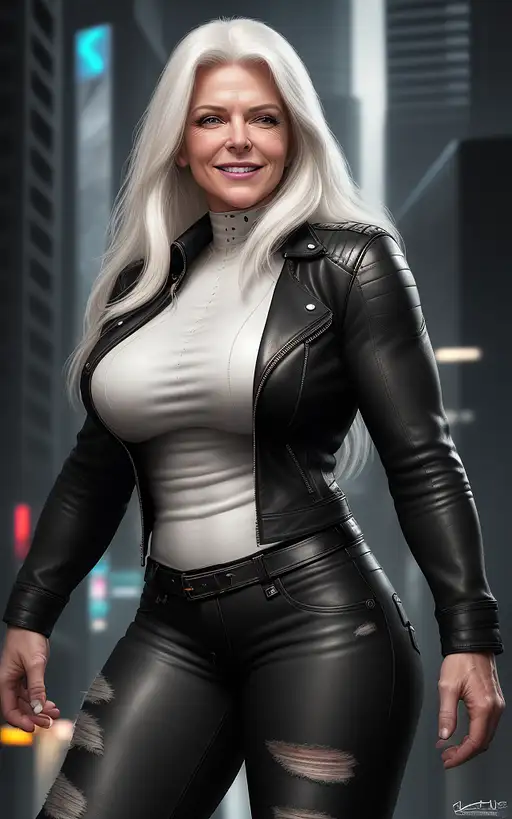 2 years ago ultrarealistic, hyperrealist, photorealistic, analog style, cinematic lighting, hyper-realistic, film grain, mid-age woman with muscles, biceps, long white hair, wears white leather jeans, white top, white leather jacket. detailed white boots, standing in futuristic city, detailed clothes, smiling, blush, realistic, real skin texture, dark, tattered clothing, Pressy 0 21