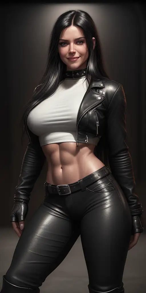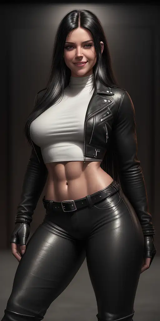2 years ago ultrarealistic, hyperrealist, photorealistic, analog style, cinematic lighting, hyper-realistic, film grain, girl with muscles, biceps, long hair, black hair, wears black leather jeans, white top, black leather jacket. black boots, detailed clothes, detailed boots, smiling, blush, Pressy 0 38