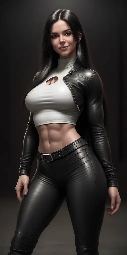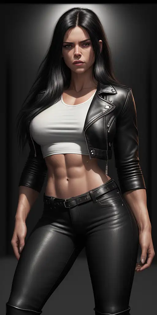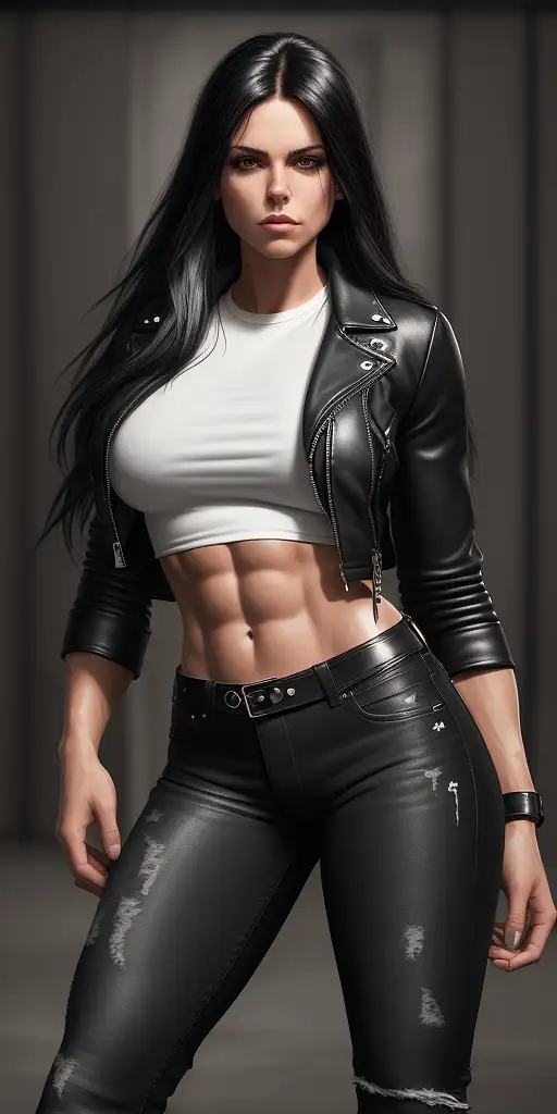 2 years ago girl with muscles, biceps, long hair, black hair, wears black leather jeans, white top, black leather jacket. black boots, ultrarealistic, hyperrealist, photorealistic, analog style Pressy 0 29