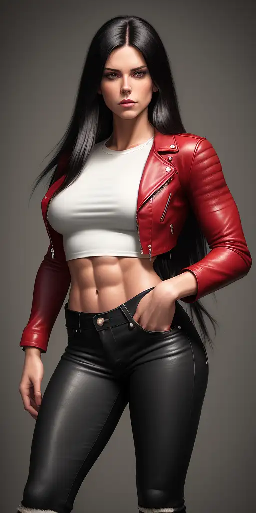 2 years ago ultrarealistic, hyperrealist, photorealistic, analog style, girl with muscles, biceps, long hair, black hair, wears red leather jeans, white top, black leather jacket, black t-shirt Pressy 0 38