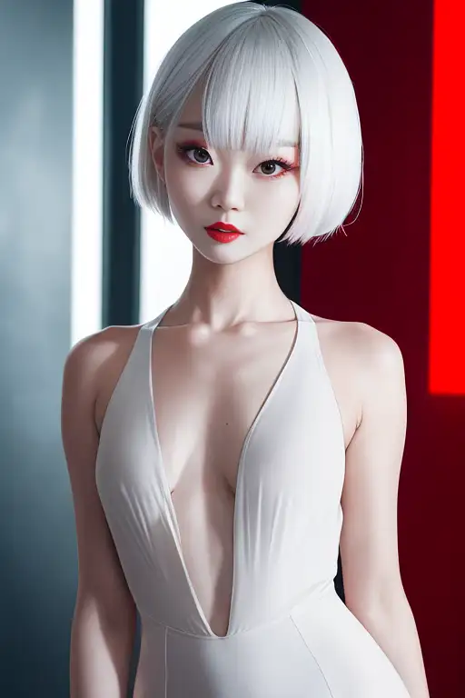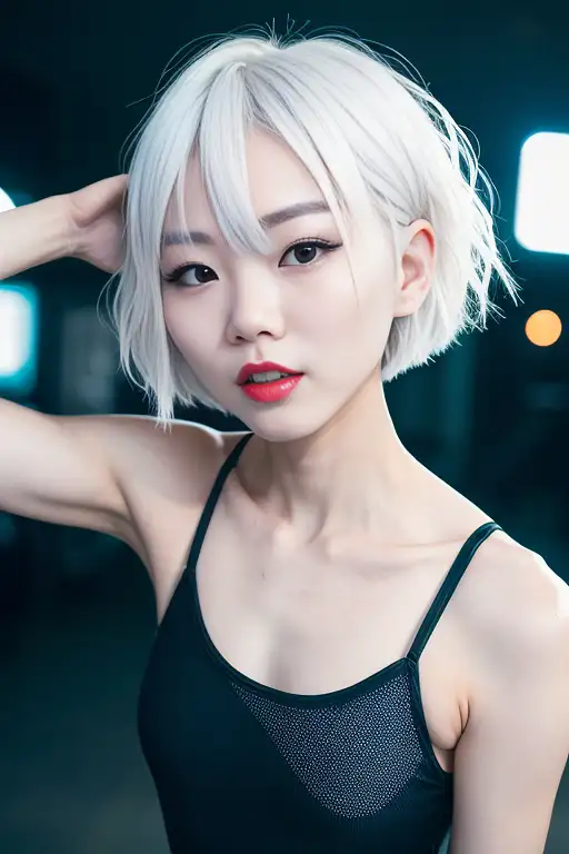 over 2 years ago (1girl), (full body), Beautiful Korean woman, kpop idol, (wearing a futuristic singlet), (white hair), (Cute Loose Bob hairstyle), (red lips), (small breasts), (toned stomach), cyberpunk, dramatic lighting, (photo realism:1.4), symmetrical eyes, realistic, sharp focus, HD, highly detailed, intricate, photography, hyperrealism, hyperrealistic, film, studio portrait, detail, 8k uhd Rachey13x 3 140