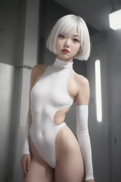 over 2 years ago (1girl), (full body), Beautiful Korean woman, kpop idol, (futuristic sci-fi bodysuit), (white hair), (Cute Loose Bob hairstyle), (red lips), (small breasts), (toned stomach), dramatic lighting, (photo realism:1.4), symmetrical eyes, realistic, sharp focus, HD, highly detailed, intricate, photography, hyperrealism, hyperrealistic, film, studio portrait, detail, 8k uhd Rachey13x 3 87