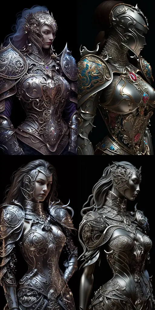over 2 years ago The Princess is clad in a suit of armor that is both ornate and functional. The armor is made of polished steel, intricately etched with swirling patterns and adorned with gemstones of every color. The armor is perfectly fitted to her body, accentuating her curves while providing maximum protection in battle. --q 2 --s 750 --ar 9:18 Rachey13x 14 530