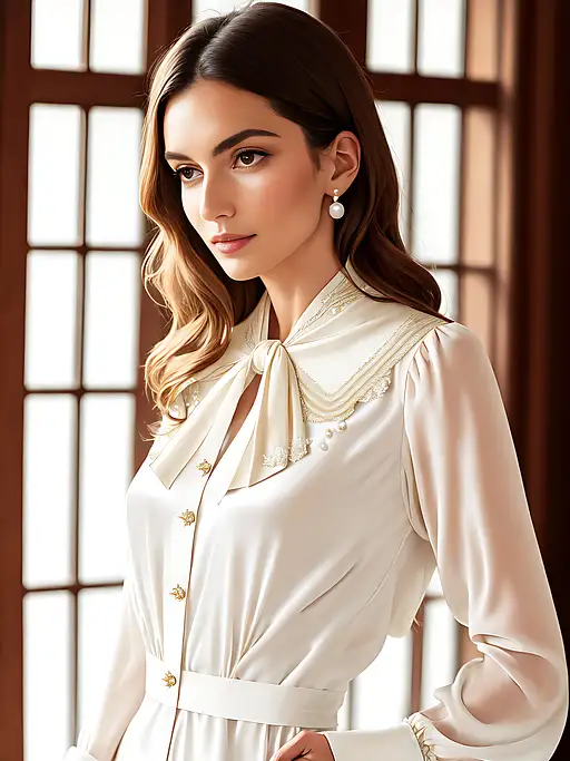 over 2 years ago The woman's blouse is a soft, ivory silk that drapes elegantly over her frame. It has a high collar that frames her face beautifully, and the cuffs are adorned with delicate pearl buttons that add a touch of femininity to the overall look. Rachey13x 14 520