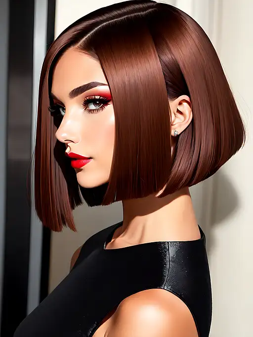 over 2 years ago Her hair is styled in a sleek, modern bob that falls just above her shoulders. It is a rich chestnut color, with subtle highlights that catch the light and add depth to her locks. The woman's makeup is flawless, with a subtle smoky eye and a bold red lip that exudes confidence and power. Rachey13x 10 610
