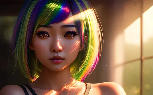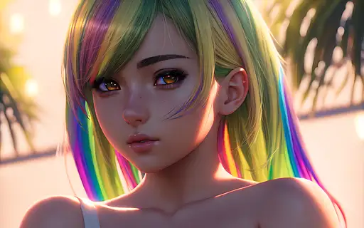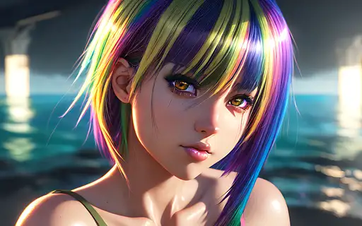 over 2 years ago ultra realistic, ultra detailed, beautiful anime girl, olive skin, detailed gorgeous face, medium length rainbow hair, cinematic lighting, lumen reflections, photography, stunning environment, Hyperrealism Rachey13x 0 140