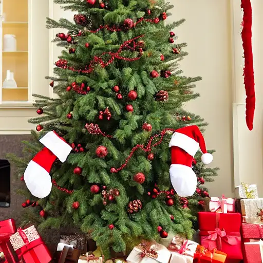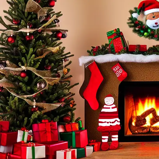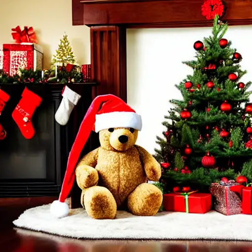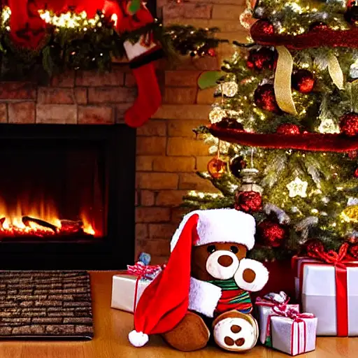 christmas tree, teddy bear with santa hat, fireplace