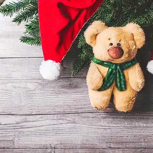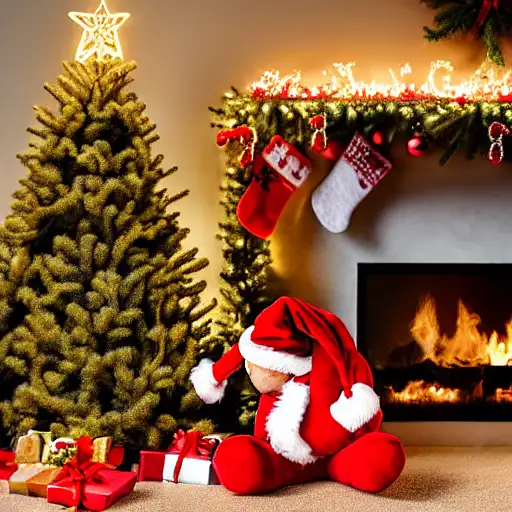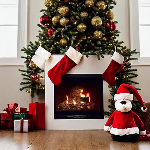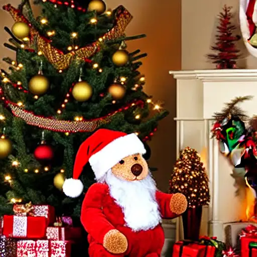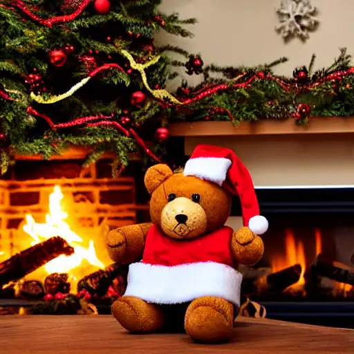 christmas tree, teddy bear with santa hat, fireplace