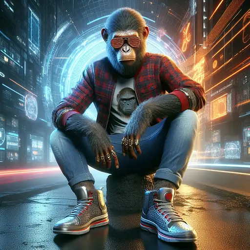 almost 2 years ago King of Apes, ruling the urban jungle with style, Donned in casual fashion with a cyberpunk twist, this regal ape rocks the scene with trendy sneakers, sunglasses, and sleek jeans. A fusion of primal majesty and futuristic Ratempko 1 130