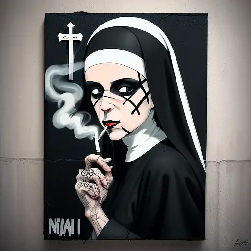 a painting of a nun smoking a cigarette, style of Joseph Xerri, religious punk art, art nun banksy graffiti, urban graffiti word art inspired by Joseph Xerri, banksy, nun fashion model, female art, catholic religious art, street art:2, by Banksy, catholic punk, streetart, bold graphic graffiti, inspired by Daze, artist ultra-detailed cinematic lighting, battered, low angle, trending on artstation, 4k, hyper realistic, focused, extreme details, unreal engine 5, cinematic, masterpiece, art by studio ghibli, intricate artwork by Joseph Xerri