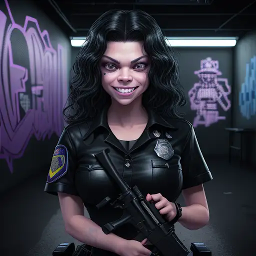 almost 2 years ago [Young girl kidnaps cop], [Vanessa Ferlito style from the movie death proof],[ Pixel art, black light], she's smiles Holding a gun to the police officers head while he's tied up to a chair, cyber light, ultrarealistc hyperrealism, ultra-detailed,UKIYO-E 3D RENDER style, graffiti Pixel art, ultrarealistc cinematography Reckoningartq 0 38