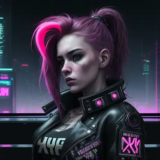 2 years ago Source_ hyper-realistic digital version of the young woman, captures every detail of her features, cinematography full shot, fit shap, 4kmegapixcil, ultrarealistc a rebellious streak, a love of punk music, Her military flankjacket protects her, The surrounding Darksynth environment is violent, neon-lit cityscape, with towering skyscrapers, flickering holographic ads for futuristic products, neonpunk, Vigilante Justice will happen, cyberpunk, The sense of oppression_despair is palpable in the atmosphere, with crowds of faceless figures moving hurriedly through the streets_ drones hovering ominously overhead, photorealistic, cyberpunk, color splash, inspired by Agnes Lawrence, complete, 4k Octane, cinematography Reckoningartq 0 56