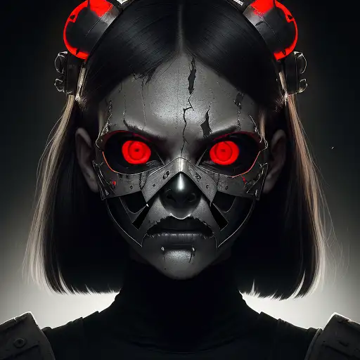 2 years ago portrait of a girl wearing a menacing broken skull mask made from hardened metal, the mask features visible cracks and dents, giving it an aged and battle-worn appearance, Inside the skull's eye sockets, glowing red lenses can be seen, providing her with enhanced vision and night vision capabilities, trending on artstation,t symmetrical artwork. cinematic, hyper realism, high detail, octane render, 8k Reckoningartq 1 82