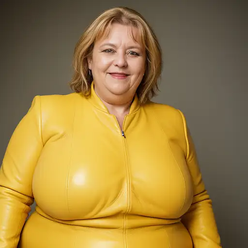 almost 2 years ago hyper realistic headshot photo of a 55 year old german woman, overweight, wearing a yellow black striped leather suit, looking into the camera smiling slightly Reeph 0 26