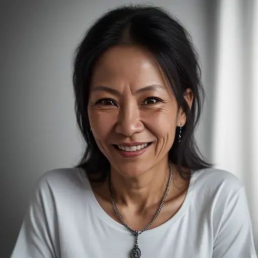almost 2 years ago hyper realistic headshot photo of a 45 year old corean woman, white t-shirt, extreme slim, extreme skinny, expensive jewelry, looking into the camera, smiling slightly, ultrarealistic, soft lighting, 8k Reeph 0 35