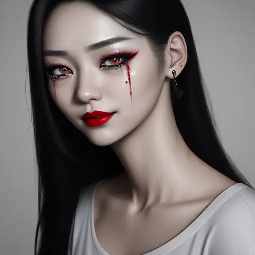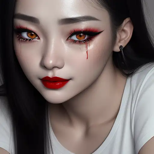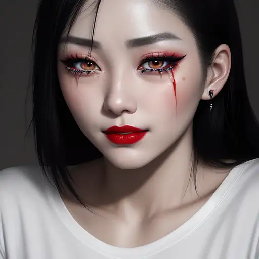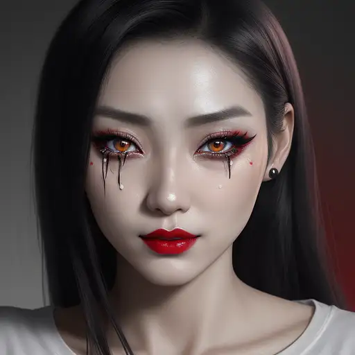 almost 2 years ago hyper realistic headshot photo of a 25 year old corean woman, white t-shirt, extreme slim, extreme skinny, red lipstick and black eyeshadow, she has a depressed look, some tears on her face and her makeup is smudged, expensive jewelry, looking into the camera, smiling slightly, ultrarealistic, soft lighting, 8k Reeph 0 34