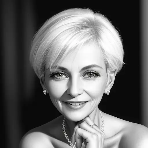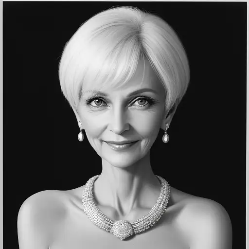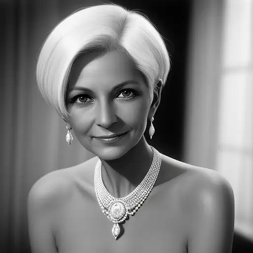 almost 2 years ago 60 year old black and white photography of an elegant woman, short grey hair, slim, skinny, expensive jewelry, looking into the camera, smiling slightly, 35mm black and white film, Reeph 0 32