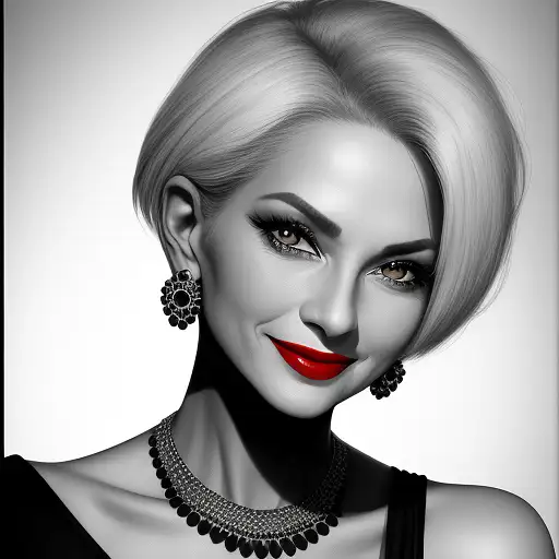 almost 2 years ago 60 year old black and white photography of an elegant woman, short grey hair, slim, skinny, Make-up, lipstick and eyeshadow, expensive jewelry, looking into the camera, smiling slightly, 35mm black and white film, Reeph 0 31