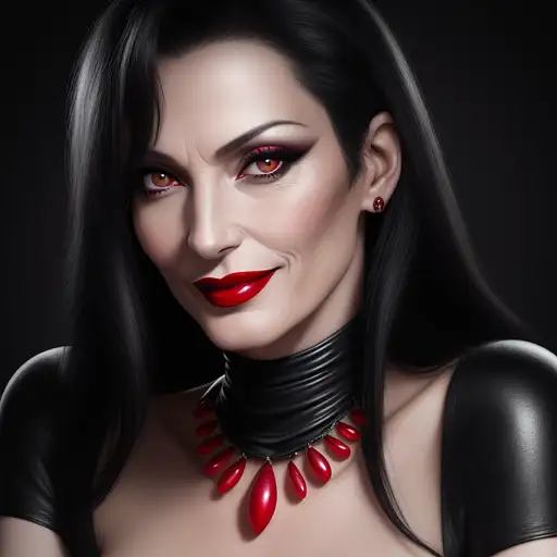 almost 2 years ago hyper realistic headshot photo of a 60 year old dominatrix, black hair, slim, skinny, Make-up, red lipstick, expensive jewelry, looking into the camera, smiling slightly, ultrarealistic, soft lighting, 8k Reeph 1 22