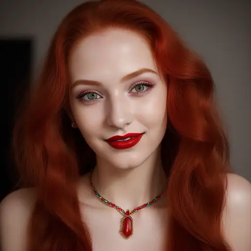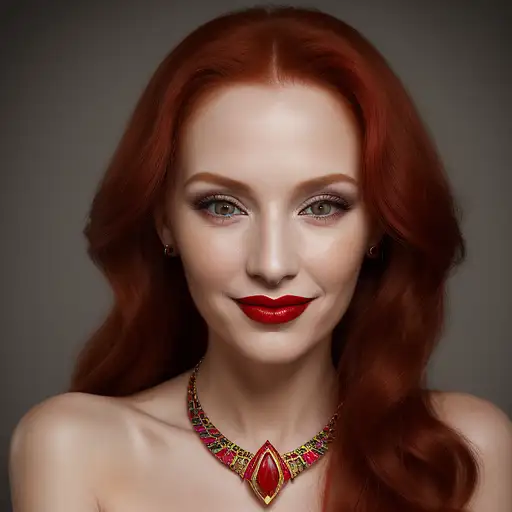 almost 2 years ago hyper realistic headshot photo of a 20 year old stylish, woman, elegant, long red hair, slim, skinny, colorful Make-up, red lipstick, expensive jewelry, looking into the camera, smiling slightly, ultrarealistic, soft lighting, 8k Reeph 1 34