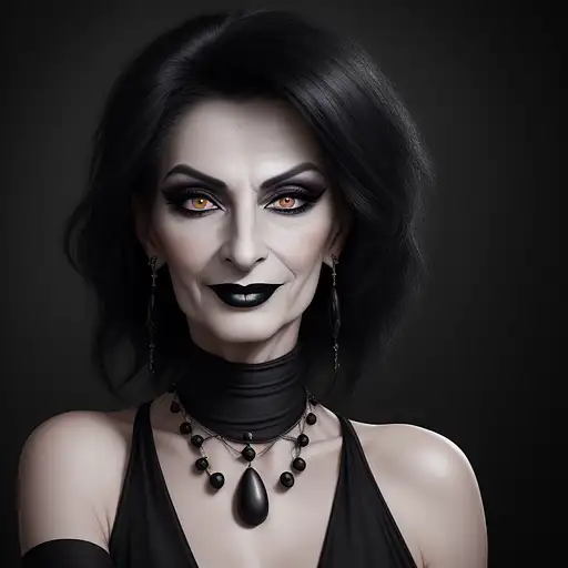 almost 2 years ago hyper realistic headshot photo of a 60 year old dominatrix, black hair, slim, skinny, Make-up, black lipstick and black eyeshadow, expensive jewelry, looking into the camera, smiling slightly, ultrarealistic, soft lighting, 8k Reeph 0 15