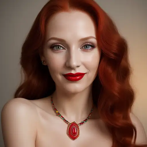 almost 2 years ago hyper realistic headshot photo of a 30 year old stylish, woman, elegant, long red hair, slim, skinny, colorful Make-up, red lipstick, expensive jewelry, looking into the camera, smiling slightly, ultrarealistic, soft lighting, 8k Reeph 0 28