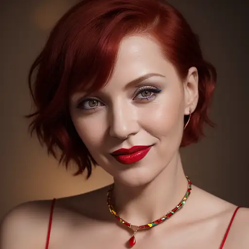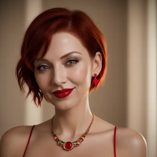 almost 2 years ago hyper realistic headshot photo of a 40 year old stylish, woman, movie star, elegant, short red hair, slim, skinny, colorful Make-up, red lipstick, expensive jewelry, looking into the camera, smiling slightly, ultrarealistic, soft lighting, 8k Reeph 0 34