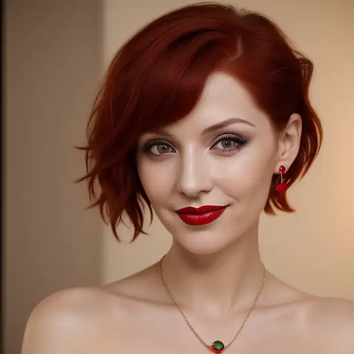 almost 2 years ago hyper realistic headshot photo of a 30 year old stylish, woman, elegant, short red hair, slim, skinny, colorful Make-up, red lipstick, expensive jewelry, looking into the camera, smiling slightly, ultrarealistic, soft lighting, 8k Reeph 0 35