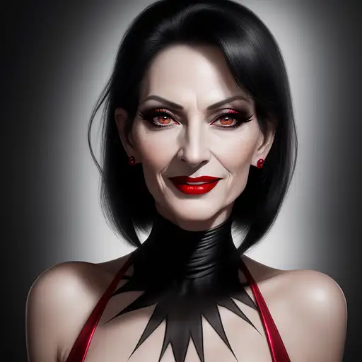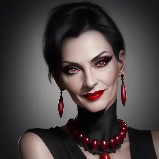 almost 2 years ago hyper realistic headshot photo of a 60 year old dominatrix, black hair, slim, skinny, Make-up, red lipstick, expensive jewelry, looking into the camera, smiling slightly, ultrarealistic, soft lighting, 8k Reeph 1 24