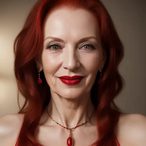 almost 2 years ago hyper realistic headshot photo of a 55 year old stylish, woman, elegant, long red hair, slim, skinny, colorful Make-up, red lipstick, expensive jewelry, looking into the camera, smiling slightly, ultrarealistic, soft lighting, 8k Reeph 0 18