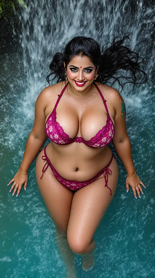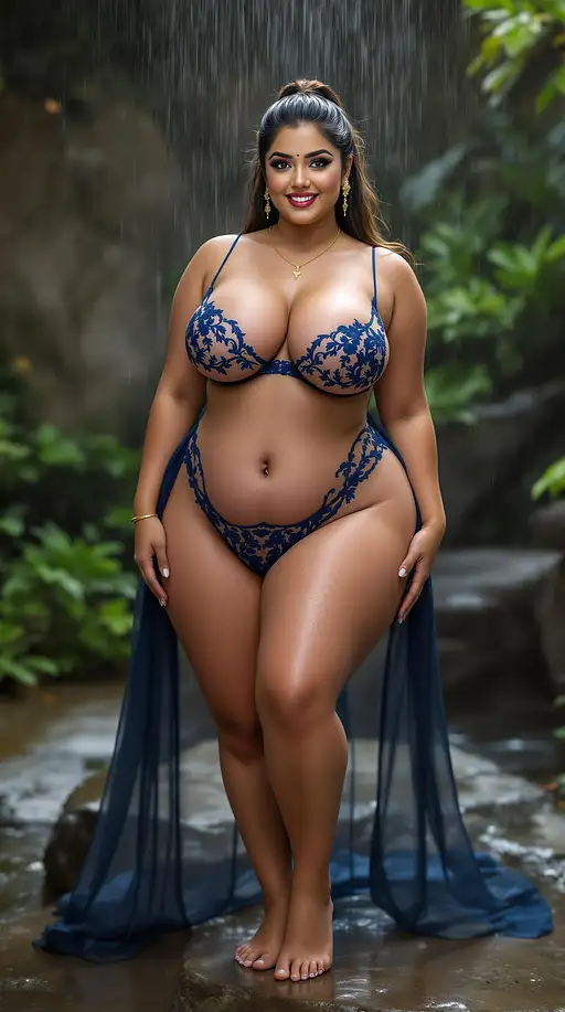 a full view body picture of rear view of a plus size south Indian sexy woman with realistic look of a very hot plus size girl sexy bikini girl woman rear view with heart shape butt spreading her beautiful legs sideview cleavage girl alluring smiley looking at her back hot face intricate tight cleavage with curvy hip with beautiful hair style sexy waist view of her body smiling showing smiles on her sexy tongue with beautiful curvy boobs cleavage sexy laughing on her sexy thick lips smile on beautiful sexy Black eyes standing by a sexy garden of a beautiful mansion house with transparent blue and white polka dots bra panty standing in front of a beautiful sexy beach house. Use light and shadow to capture the delicate contours of her face and the intricate details of her classic hair style black vibrant colors to capture the intensity of the flowers, her sexy tight and skinny lace bra skinny and panty boob hanging. create a sense of balance and harmony in the composition of her body shape curves and smile on sexy tongue . Show her beautiful high heel shoes matching sexy bra color