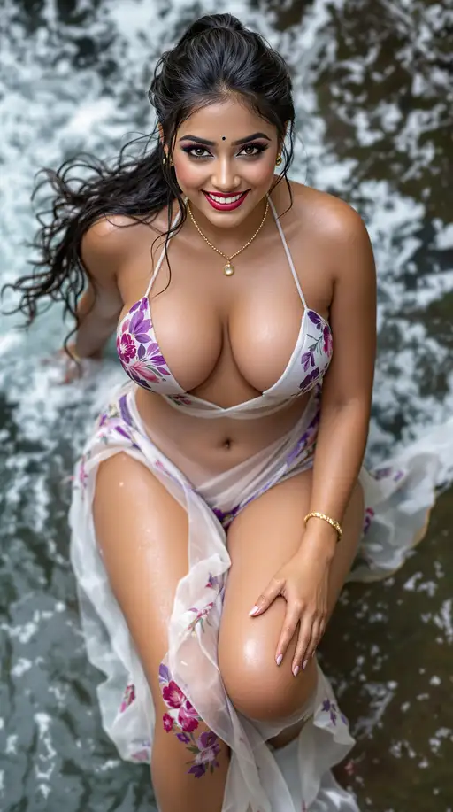 7 months ago Top view , full body front huge curved shape hip image of a 25 year old plus size sexy hourglass figured South Indian actress Roopa top view boobs sitting below the water falls getting shower her wet body with clothes getting shower by a garden and pool water falls she has rain sweats droplets on her body and face wet looking up with alluring sexy teeth laughing smile on her black big eyes with black mascara embroidered bright dark white purple color transparent chiffon body tight exposed boobs with no bra and top view boobs strapless deep neck huge tits cleavage curvy boobs exposed curve breasts, very big breasts boobs ponytail hair athletic woman, view from behind, full body photograph, looking at viewer, slight pout, she has black brown marron mixed blonde hair, brown eyes, beautiful body curved shape hip and legs she is touching her tits smile to me pointing her right hand figures on her boobs chest Rongeela PRO 0 18