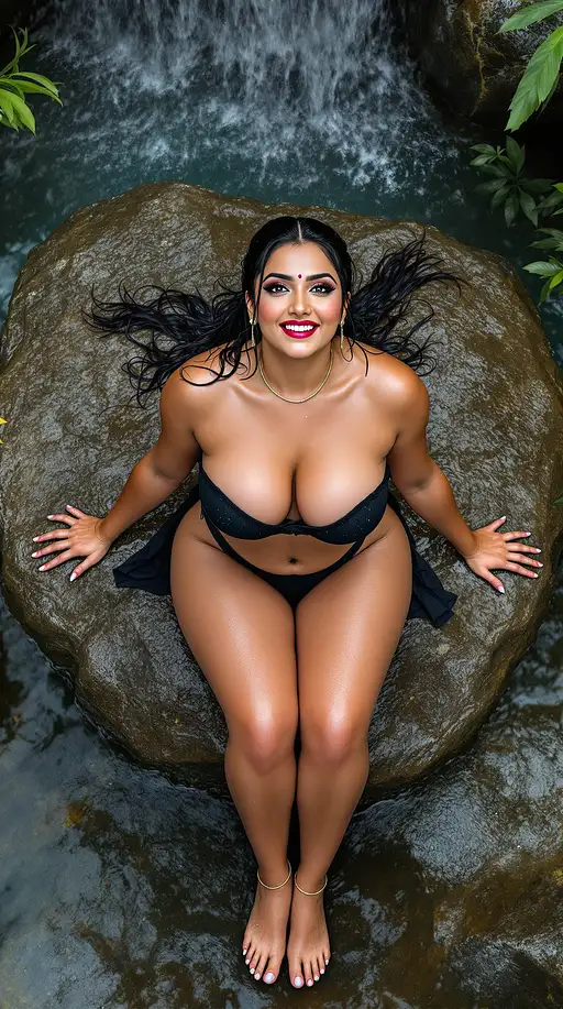 7 months ago Top view , full body front huge curved shape hip image of a 25 year old plus size sexy hourglass figured South Indian actress Roopa top view boobs sitting on a large rock spreading her soft legs getting shower her wet body with clothes getting shower by a garden and pool water falls he has rain sweats droplets on her body and face wet looking up with alluring sexy teeth laughing smile on her black big eyes with black mascara embroidered bright dark black while color transparent chiffon body tight bikini bra and top view boobs strapless deep neck huge tits cleavage tiny bra exposed curve breasts, very big breasts boobs ponytail hair athletic woman, view from behind, full body photograph, looking at viewer, slight pout, she has black and brown-maroon mixed blonde hair, green eyes, beautiful body curved shape hip and legs she is touching her tits sexy smile to me pointing her right hand figures on her boobs chest Rongeela PRO 0 18