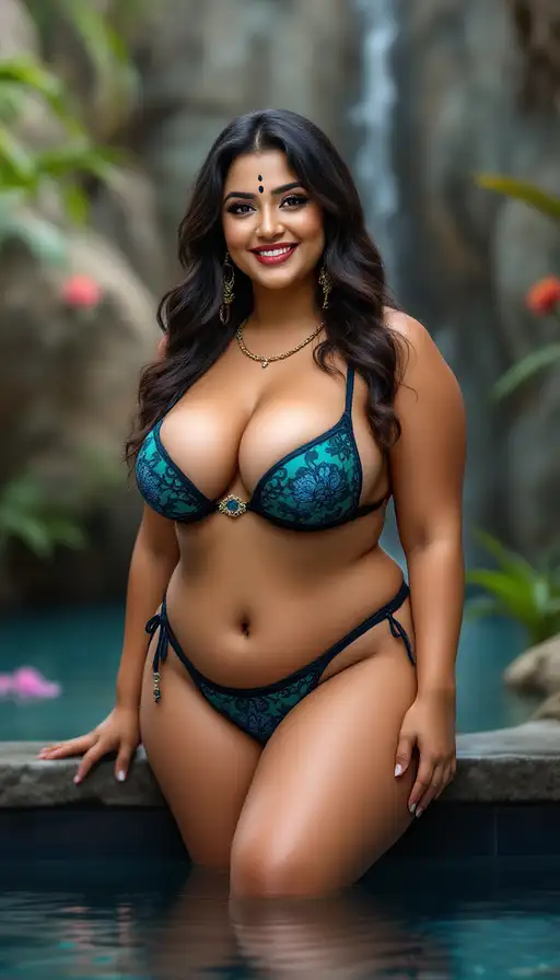 9 months ago a full body picture with realistic front view very hot Indian plus size sexy bikini huge size cleavage girl alluring smiley sexy hot face alluring look with curvy hip butt ass with royal blue bikini with black bindi on forehead with beautiful hair khopa style sexy waist chain rear view of her body looking at her back water of the pool some plants by the rock with beautiful curve of boobs cleavage sexy laughing on her sexy thick lips sexy teeth smile on beautiful sexy Black eyes standing by a sexy garden with transparent floor on water with a nice water falls by a sexy pool. Use light and shadow to capture the delicate contours of her face and the intricate details of her classic hair style black vibrant colors to capture the intensity of the flowers, her light purple sexy tight bra 36 and panty. create a sense of balance and harmony in the composition of her body shape curves and smile. Show her beautiful high heel shoes matching sexy bra color Rongeela PRO 0 21