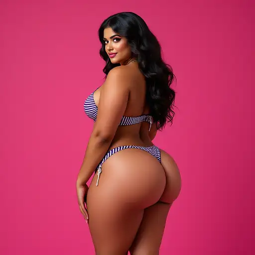 9 months ago a full body of Indian woman side front view large round heart shaped plus size sexy ass butt ass rear view with side view elevated large boobs, the woman is looking at her back to me with beautiful black eyes plus size legs with high heels matched color cleavage realistic looking Sexy Indian plus size sexy purple and white stripe bikini butt Indian woman looking smiling at me with sexy eyes and beautiful skin color with smiley face a Indian hot and sexy front view looking smiling at her back girl looking at her back standing on her heart shaped curvy body muscle shapes ass butt boobs and legs transparent skin navy blue very tiny and slim bare and tiny transparent no bra no panty boobs and hip see through bra and tiny while panty , capture the delicate contours of her face and side front view cleavage big boobs showing round shape ass butt full leg view and the intricate details of her classic hair style black vibrant colors to capture the intensity of the garden her hairs styles looking at her back laughing loud smiling Gorgeous Cupcake Hued Bun-Style Bridal Hairstyle, she is laughing out loud sexy with moody look alluring Rongeela PRO 0 18