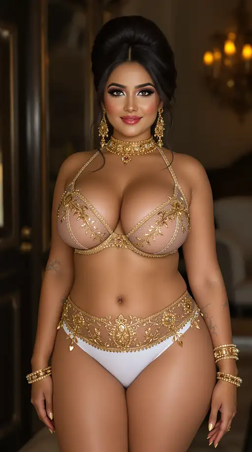 9 months ago a full front view large puffy boobs ass looking with beautiful black eyes plus size legs with high heels matched color cleavage realistic looking Sexy Indian plus size sexy white Indian woman with sexy beautiful skin color with smiley face a Indian hot and sexy standing on her heart shaped ass butt boobs and legs transparent gold and black very bare and tiny transparent bare bra boobs and hip see through bra and tiny while panty , capture the delicate contours of her face and the intricate details of her classic hair style black vibrant colors to capture the intensity of the garden her hairs styles Gorgeous Cupcake Hued Bun-Style Bridal Hairstyle, she is laughing out loud sexy with moody look alluring Rongeela PRO 0 6