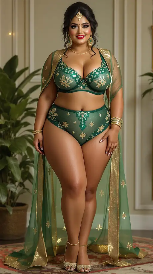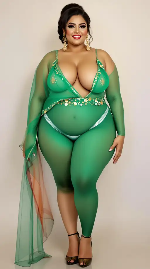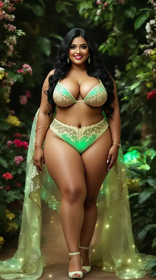 9 months ago a full front view large puffy boobs ass looking with beautiful black eyes plus size legs with high heels matched color cleavage realistic looking Sexy Indian plus size sexy white Indian woman with sexy beautiful skin color with smiley face a Indian hot and sexy standing on her heart shaped ass butt boobs and legs transparent emerald green and gold light very thin transparent bra boobs and hip see through bra and tiny while panty , capture the delicate contours of her face and the intricate details of her classic hair style black vibrant colors to capture the intensity of the garden her hairs styles Gorgeous Cupcake Hued Bun-Style Bridal Hairstyle, she is laughing out loud sexy, she is looking at her back with smiles see through side hip view Rongeela PRO 0 11