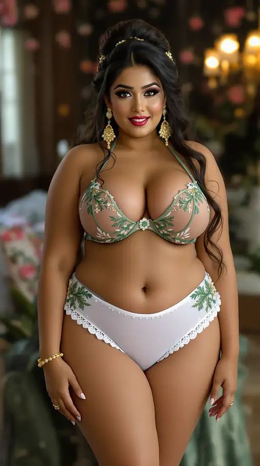 9 months ago a full front view large puffy boobs ass looking with beautiful black eyes plus size legs with high heels matched color cleavage realistic looking Sexy Indian plus size sexy white Indian woman with sexy beautiful skin color with smiley face a Indian hot and sexy standing on her heart shaped ass butt boobs and legs transparent emerald green and gold light very thin transparent bra boobs and hip see through bra and tiny while panty , capture the delicate contours of her face and the intricate details of her classic hair style black vibrant colors to capture the intensity of the garden her hairs styles Gorgeous Cupcake Hued Bun-Style Bridal Hairstyle, she is laughing out loud sexy, she is looking at her back with smiles see through side hip view Rongeela PRO 0 10