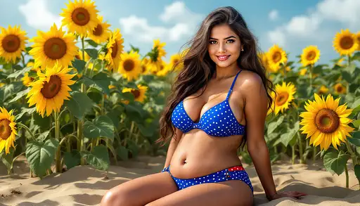 10 months ago hot Indian sexy medium plus size woman full image bikini slim smooth belly puffy naval woman full picture beautiful blue and red polka dots bra on her colorful bikini panty sitting on her sexy legs on the sandy beach with her sexy smile and very sexy eyes Create a photo-realistic portrait of a beautiful woman standing amongst a field of sunflowers. Use light and shadow to capture the delicate contours of her face and the intricate details of her hair. Rongeela PRO 0 13