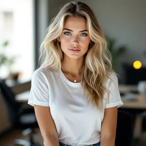 8 months ago Create a realistic, full-body portrait of a stunning young woman with blonde hair and blue eyes. She's wearing a white t-shirt, blue denim jeans, and minimal jewelry, including a delicate necklace and a elegant bracelet. The background features a professional office setting ScrawnySmalls 0 37