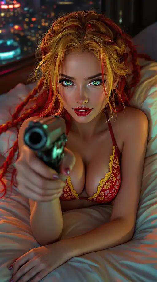 8 months ago A beautiful woman with long, braided, mixed bright red and bright yellow hair and vibrant blue-green eyes that sparkle, lays elegantly on a bed in a pose that is relaxed and inviting. She wears lace, mixed red and yellow underwear and a sheer, red top with yellow intricate designs. Her expression is complex - a mix of serious intensity, flirtiness, charm, and innocence. She holds a handgun in her right hand, aiming directly at the viewer with a hint of parody, while maintaining a soft, confident grin. The city lights outside a nearby window create a vivid backdrop, casting gentle shadows across her features. The overall tone is tense, ominous, romantic, and reminiscent of retro anime, with extreme detail and high quality. ScrawnySmalls 0 40